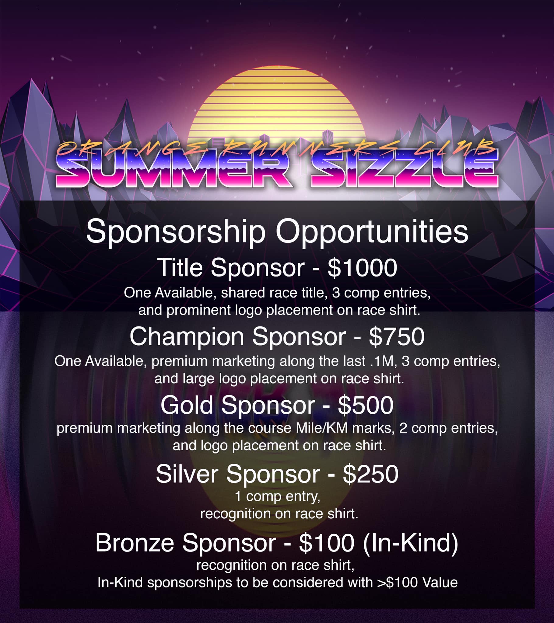 The second annual Orange Runners Club Summer Sizzle XC 5k is a cross country race rooted in the spirit of team work, dedication, competition and fun. Join us this July at the Rich Furst Sanfordville Elementary School XC Course in Warwick, NY, home to a rich history of Cross Country running, including the host of the NYSPHSAA State Championship. |